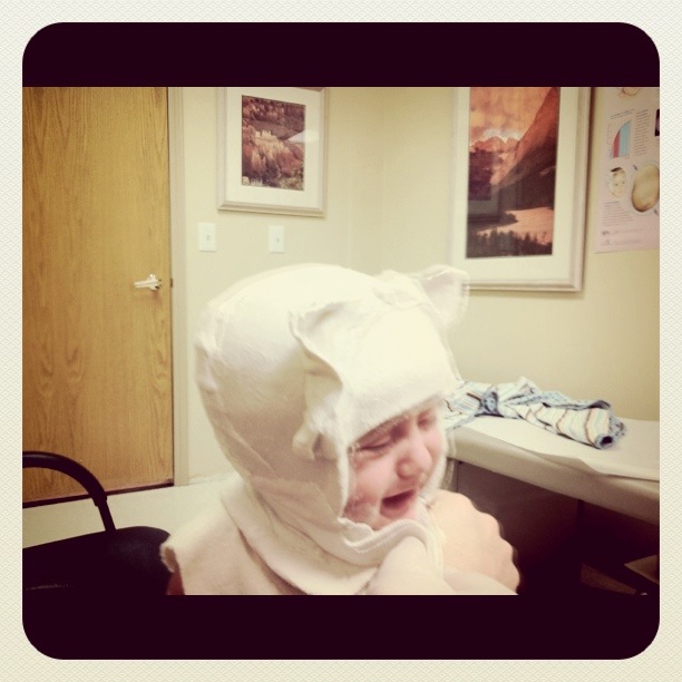 First they placed a nylon sock over his head protecting his hair from the plaster then they laid this stuff that I would explain it kind of like paper mache..? Dad reported that he actually did really well during the whole process.. which takes about 12 minutes. But he wasn't to happy when they had to take it off.. But that was it! And to top it off the poor little guy has a little cold.. not a fun day for the little man..