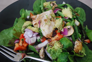 Spinach salad: IN the mix, spinach, chicken, 1/2 sliced apple, brussel sprouts, green beans, drizzeled with balsamic dressing.